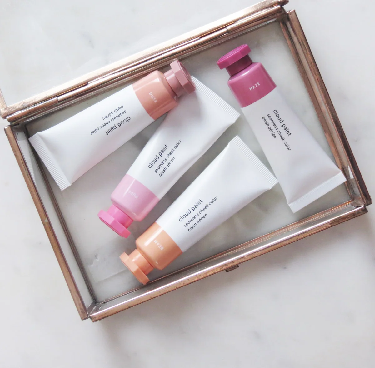 The Cloud Paints are formulated with collagen, which retains water to visibly plump the skin, a smooth gel system for easy application, and blurring powder pigments, which ensure an even finish that's never streaky. They do almost feel cushion-y and smooth as you blend them onto the cheeks. They remind me of a formula you'd find inside a cushion blush. I've found they apply best with fingers - they blend so easily and seamlessly into the skin, and once blended they really do make it look like you're just blushing from within. Their texture lends itself well to mixing and layering with multiple shades, too - Dusk mixes well with all of the other shades because it's neutral. Mixing Haze and Puff will give you a slightly deeper pink shade. Dusk and Beam make a beautiful warm bronze glow on the skin. My favorite pairing is Dusk and Puff because it turns into the perfect neutral pink, which is my ultimate favorite blush shade.