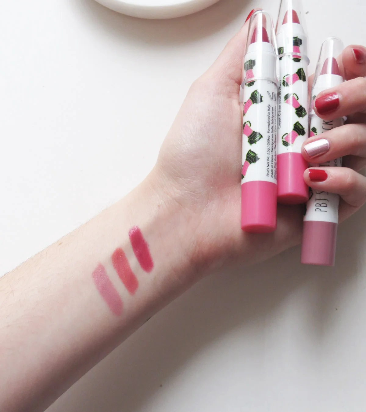 The Pucker Up & Play Set comes with three PBJ Smoothie Sticks in super wearable, everyday shades. Raisin the Roof is a super pretty pale pink mauve that is a great "my lips but better" shade, Peach Please is the peachy pink of my dreams - normally peach tones look weird on me, but this one doesn't. And Guava Nice Day (I just love the names) is a beautiful pink berry shade - it's a little more bold than I'd typically wear day to day, but it isn't too out there. The formula is so creamy and comfortable on the lips, and they're incredibly pigmented as well - something I don't always expect from lip crayons. They feel quite balmy and nourishing on the lips, so I'm a huge fan. I've already relocated these to my purse to use day to day.